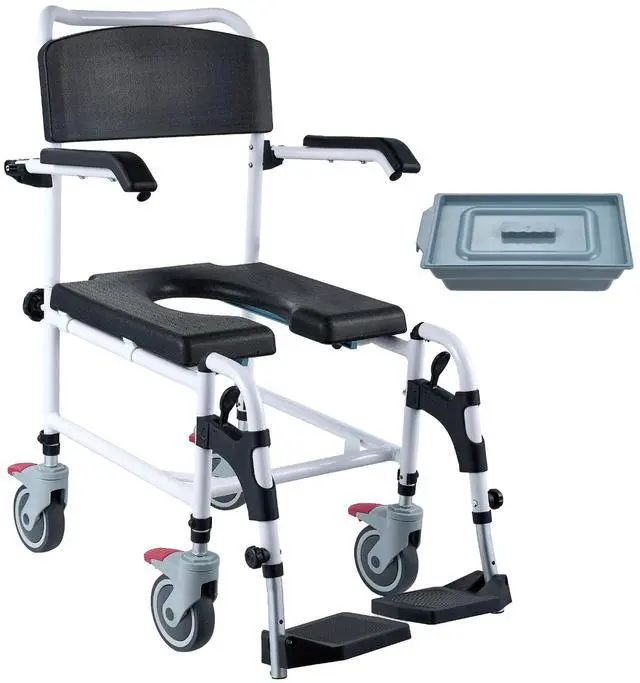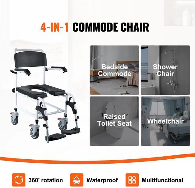 VEVOR Shower Commode Wheelchair with 4 Lockable Wheels, Footrests, Flip-up Arms, 3-Level Adjustable Height, 5L Removable Bucket, 350 LBS Capacity, Commode Chair for Adults Seniors