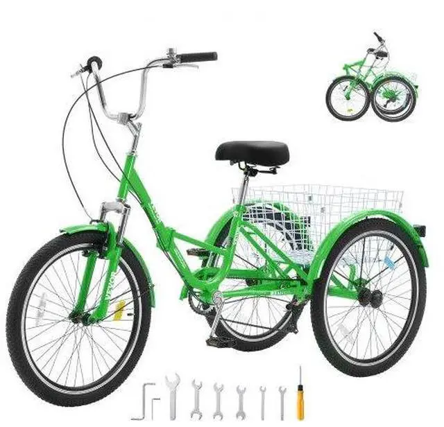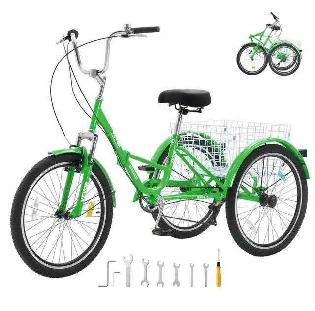 VEVOR Folding Adult Tricycle, 26-Inch 7-Speed Adult Folding Trikes, Carbon Steel 3 Wheel Cruiser Bike with Basket & Adjustable Seat, Shopping Picnic Foldable Tricycles for Women, Men, Seniors (Green)
