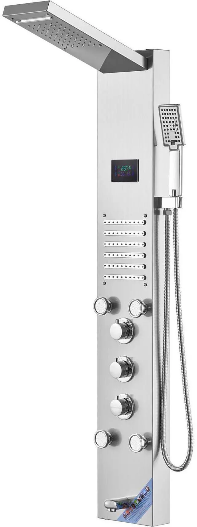 Fuctions: Rainfall, Waterfall, 5 Massage Jets, Tub Spout, Handheld Shower,Screen: Yes,Item Model Number: 8004FL,Shower Modes: 6,Heldhold Shower Head: 3-Setting,Material: 304 Stainless Steel,LED: Yes,Thread Size: G 1/2",Mounting Type: Wall-mounted,Product Dimensions: 53.2 × 7.9 × 17.3 inch/1350×200×440mm,Net Weight: 14.7 lbs/6.69 kg