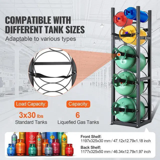 Capacity: 6(Liquefied Gas Tanks),Item Model Number: CTR330N,Front Shelf: 1197 x 325 x 30 mm / 47.12 x 12.79 x 1.18 inch,Back Shelf: 1177 x 325 x 50 mm / 46.34 x 12.79 x 1.97 inch,Product Weight: 14.18 kg/31.26 lbs,Main Material: A3 Steel,Product Size: 372 × 355 × 1170 mm/14.64 × 13.97 × 46.06 inch,Maximum Loading: 3x30 lbs (13.6KG) Tanks+3 Small Bottle Tanks