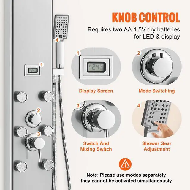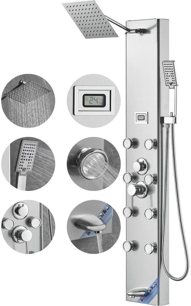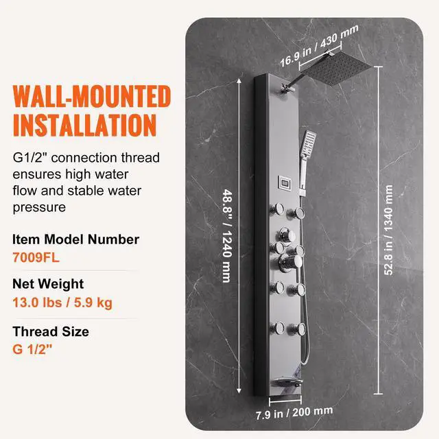 Digital Display: Yes,Fuctions: Rainfall, 8 Massage Jets, Tub Spout, Handheld Shower,Item Model Number: 7009FL,Shower Modes: 5,Heldhold Shower Head: 3-Setting,Material: 304 Stainless Steel,Thread Size: G 1/2",Mounting Type: Wall-mounted,Product Dimensions: 52.8 × 7.9 × 16.9 inch/1340×200×430mm,Net Weight: 13.0 lbs/5.9 kg