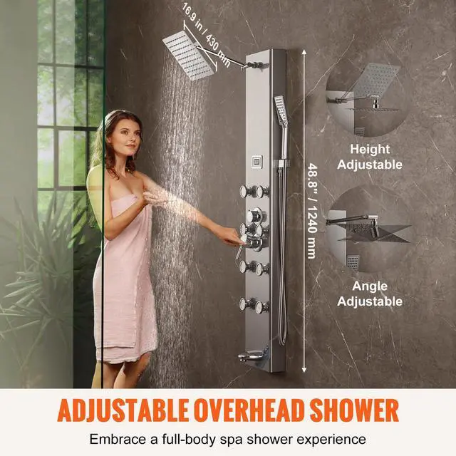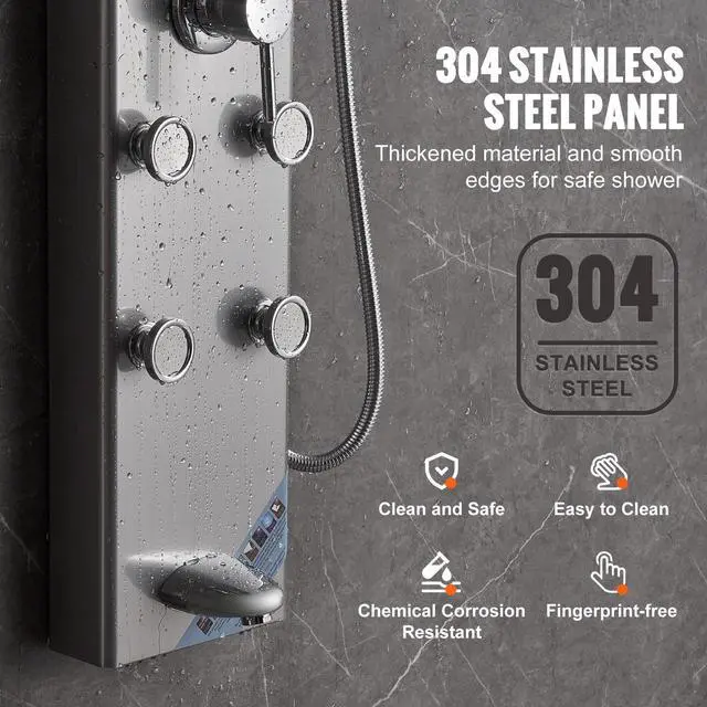 VEVOR Shower Panel System, 5 Shower Modes, Digital Display Shower Panel Tower, Rainfall, 8 Massage Jets, Tub Spout, 3-Setting Handheld Shower Head 59" Hose, Stainless Steel Wall-Mounted Shower Set