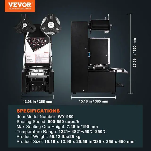 Sealing Speed: 500-650 cups/h,Item Model Number: WY-980,Product Weight: 55.12 lbs/25 kg,Max Sealing Cup Height: 7.48 in/190 mm,Temperature Range: 122-482/50-250,Product Size: 15.16 x 13.98 x 25.59 in/385 x 355 x 650 mm
