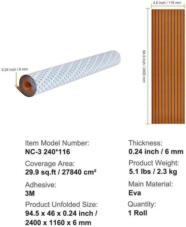 Operating Temperature: -4~122/-20 ~ 50,Product Unfolded Size: 94.5 x 46 x 0.24 inch / 2400 x 1160 x 6 mm,Item Model Number: NC-3 240*116,Product Weight: 5.1 lbs / 2.3 kg,Quantity: 1 Roll,Coverage Area: 29.9 sq.ft / 27840 cm²,Adhesive: 3M,Main Material: Eva