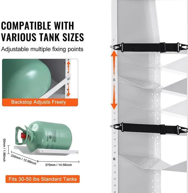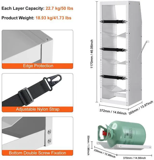 Capacity: 3 (Liquefied Gas Tanks),Item Model Number: CTR330R350,Product Weight: 41.73 lbs/18.93 kg,Shelf Size: 370 × 330 × 50 mm/14.56 × 12.99 × 1.96 inch,Main Material: A3 Steel,Product Size: 372 × 355 × 1170 mm/14.64 × 13.97 × 46.06 inch,Maximum Loading: 3 x 50 lbs (22.7KG) Tanks