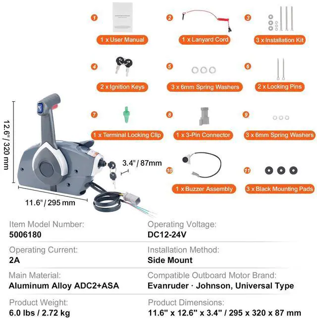 Installation Method: Side Mount,Compatible Outboard Motor Brand: Evanruder · Johnson, Universal Type,Operating Voltage: DC12-24V,Item Model Number: 5006180,Product Weight: 6.0 lbs / 2.72 kg,Product Dimensions: 11.6" x 12.6" x 3.4" / 295 x 320 x 87 mm,Operating Current: 2A,Main Material: Aluminum Alloy ADC2+ASA