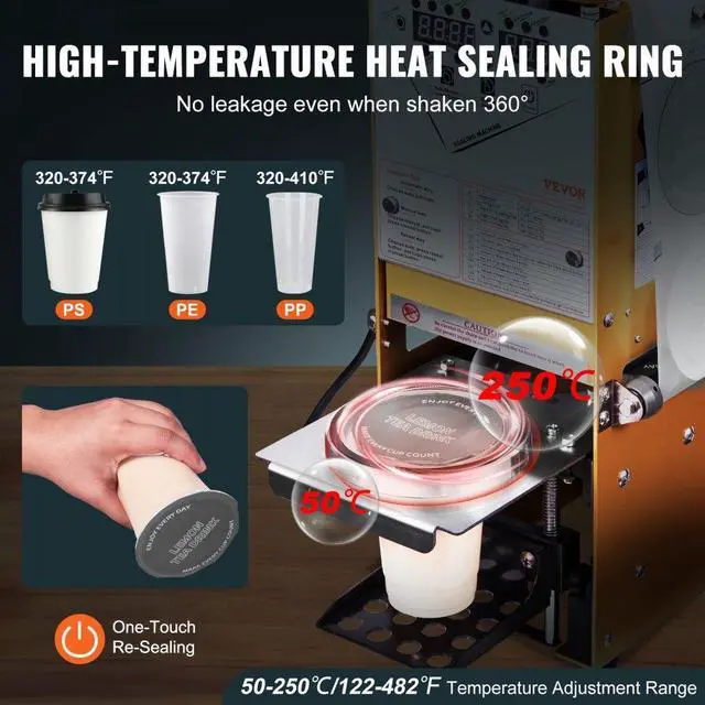 • VEVOR Fully Automatic Cup Sealing Machine, 500-650 Cups/H, Cup Sealer Machine for 180 mm Tall & 90/95 mm Cup, Electric Boba Tea Sealer with Digital Control LCD Panel for Bubble Milk Tea Coffee, Gold