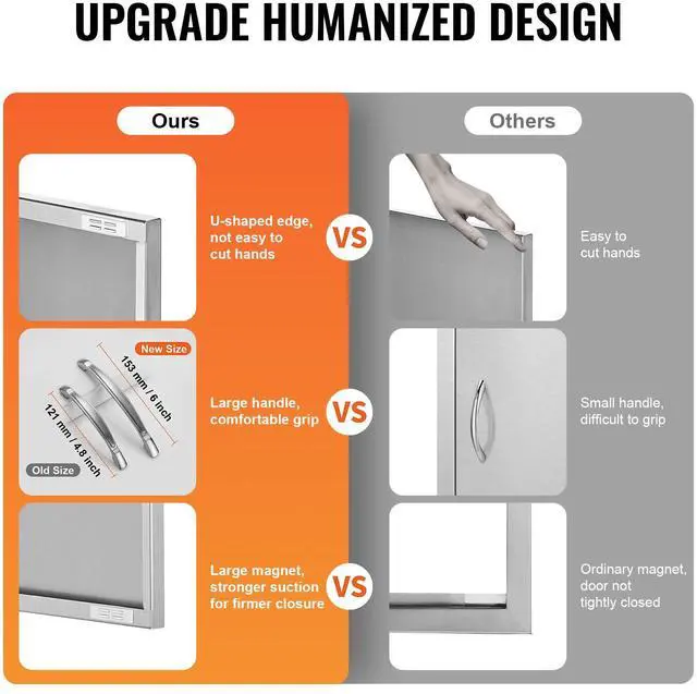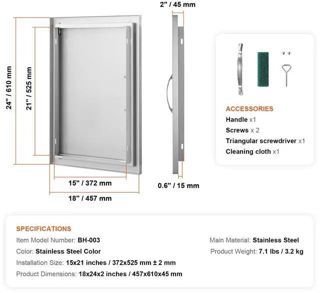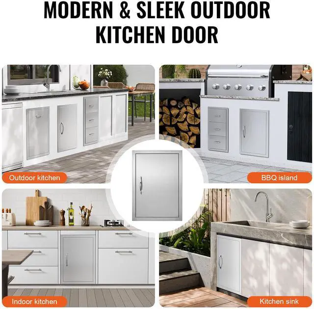 Precision Opening: Overall dimensions: 457x610x45 mm / 18x24x2 inches, installation size: 15x21inch±0.08inch/372x525mm±2mm, it is recommended to reserve an additional 0.08inch/2mm on this basis for better operation. The door is designed specifically for outdoor kitchens and barbecue islands, adding an elegant touch to your cooking area. With precise dimensions, it is easy to process, install, or dismantle. Available in various sizes and styles, it is perfect for indoor/outdoor kitchens and all other outdoor weather conditions.
