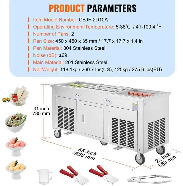 Number of Pans: 2,Item Model Number: CBJF-2D10A,Operating Environment Temperature: 5-38 / 41-100.4 ,Pan Size: 450 x 450 x 35 mm / 17.7 x 17.7 x 1.4 in,Noise (dB): 69,Net Weight: 118.1kg / 260.7 lbs(US), 125kg / 275.6 lbs(EU),Main Material: 201 Stainless Steel,Pan Material: 304 Stainless Steel