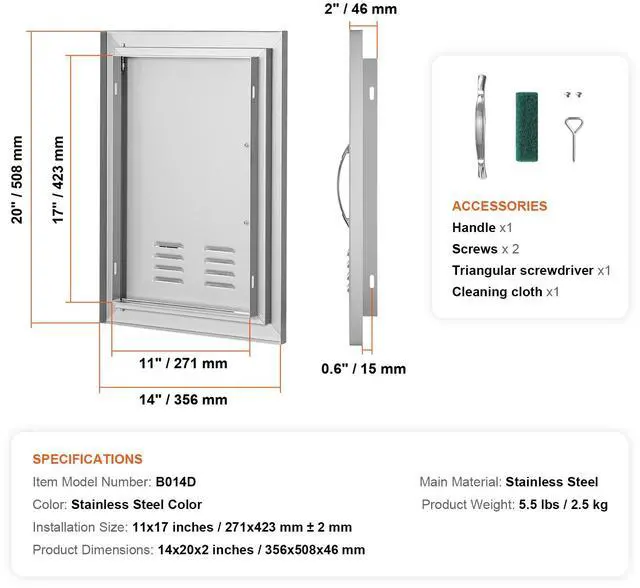 VEVOR BBQ Access Door, 14W x 20H Inch Single Outdoor Kitchen Door, Stainless Steel Flush Mount Door, Wall Vertical Door with Handle and vents, for BBQ Island, Grilling Station, Outside Cabinet