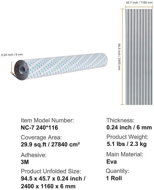 Operating Temperature: -4~122/-20 ~ 50,Product Unfolded Size: 94.5 x 45.7 x 0.24 inch / 2400 x 1160 x 6 mm,Item Model Number: NC-7 240*116,Product Weight: 5.1 lbs/2.3 kg,Quantity: 1 Roll,Coverage Area: 29.9 sq.ft / 27840 cm²,Adhesive: 3M,Main Material: Eva