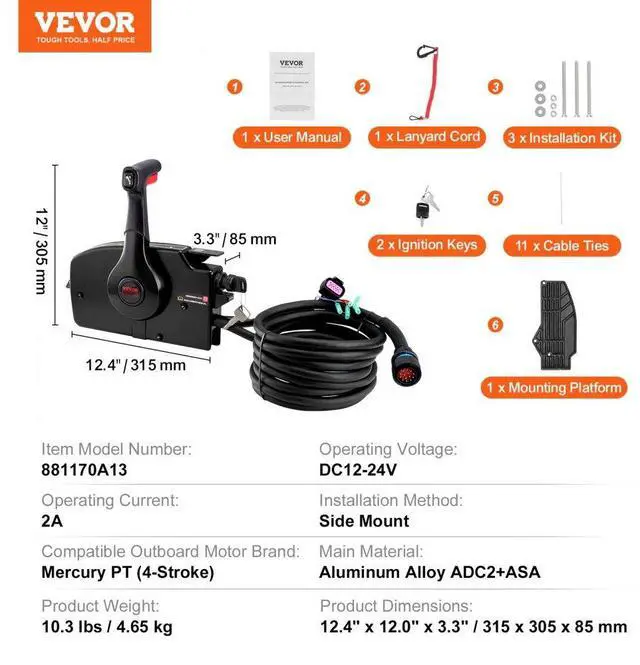 Installation Method: Side Mount,Compatible Outboard Motor Brand: Mercury PT (4-Stroke),Operating Voltage: DC12-24V,Item Model Number: 881170A13,Product Weight: 10.3 lbs / 4.65 kg,Product Dimensions: 12.4" x 12.0" x 3.3" / 315 x 305 x 85 mm,Operating Current: 2A,Main Material: Aluminum Alloy ADC2+ASA
