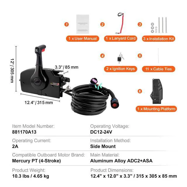 Installation Method: Side Mount,Compatible Outboard Motor Brand: Mercury PT (4-Stroke),Operating Voltage: DC12-24V,Item Model Number: 881170A13,Product Weight: 10.3 lbs / 4.65 kg,Product Dimensions: 12.4" x 12.0" x 3.3" / 315 x 305 x 85 mm,Operating Current: 2A,Main Material: Aluminum Alloy ADC2+ASA