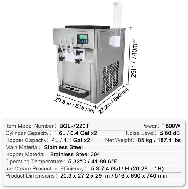 Noise Level: 66 dB,Operating Temperature: 5-32°C / 41-89.6°F,Hopper Capacity: 4L / 1.1 Gal x 2,Ice Cream Production Efficiency: 20 L(5.3 gal)/H,Hopper Material: Stainless Steel 304,Item Model Number: BQL-7220T,Cylinder Capacity: 1.6L / 0.4 Gal x2,Net Weight: 85 kg/187.4 lbs,Power: 1800W,Main Material: Stainless Steel 201