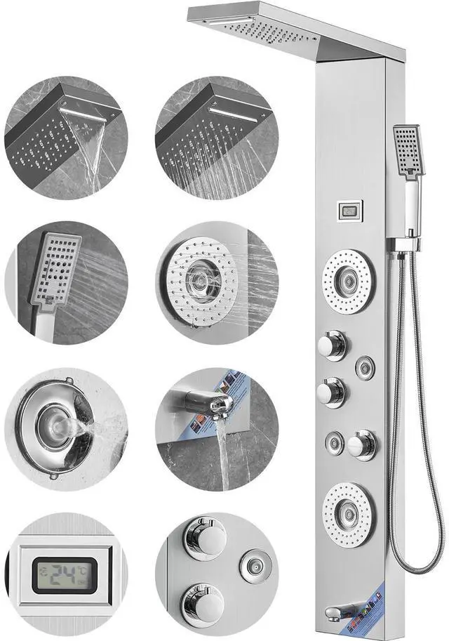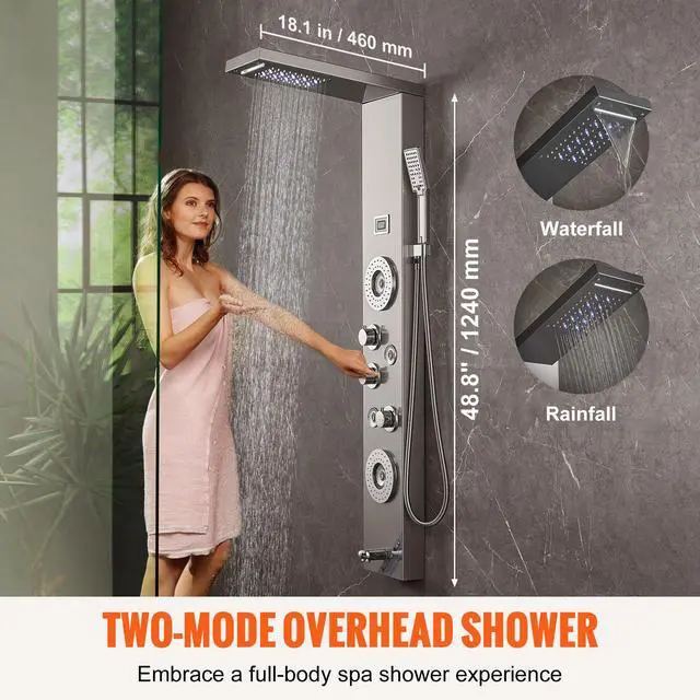 VEVOR Shower Panel System, 6 Shower Modes, LED & Display Shower Panel Tower, Rainfall, Waterfall, 4 Body Massage Jets, Tub Spout, Handheld Shower Head 59" Hose, Stainless Steel Wall-Mounted Shower Set