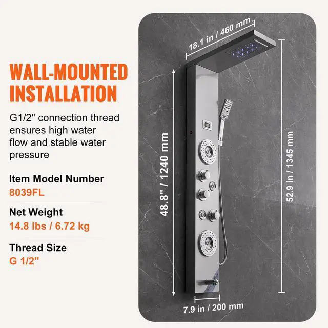 Digital Display: Yes,Fuctions: Rainfall, Waterfall, 4 Massage Jets, Tub Spout, Handheld Shower,Item Model Number: 8039FL,Shower Modes: 6,Heldhold Shower Head: 3-Setting,Material: 304 Stainless Steel,LED: Yes,Thread Size: G 1/2",Mounting Type: Wall-mounted,Product Dimensions: 52.9 × 7.9 × 18.1 inch/1345×200×460 mm,Net Weight: 14.8 lbs/6.72 kg