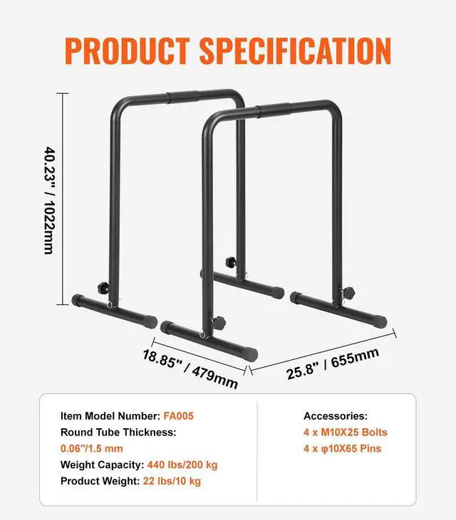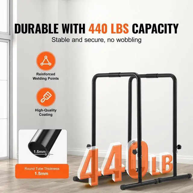 VEVOR Dip Bars, 440 lbs Capacity, Heave Duty Dip Stand Station with Adjustable Height, Fitness Workout Dip Bar Station Stabilizer Parallette Push Up Stand, Parallel Bars for Strength Training Home Gym