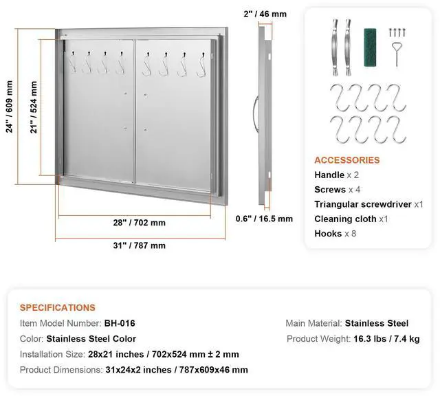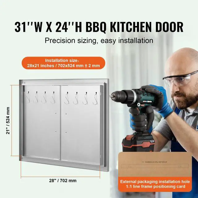 VEVOR BBQ Access Door, 31W x 24H Inch Double Outdoor Kitchen Door, Stainless Steel Flush Mount Door, Double Wall Vertical Door with Handles and Hooks, for BBQ Island, Grilling Station, Outside Cabinet