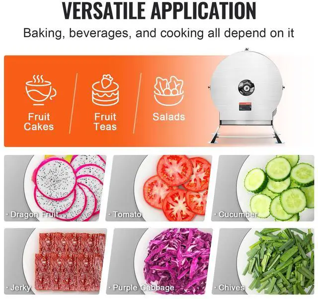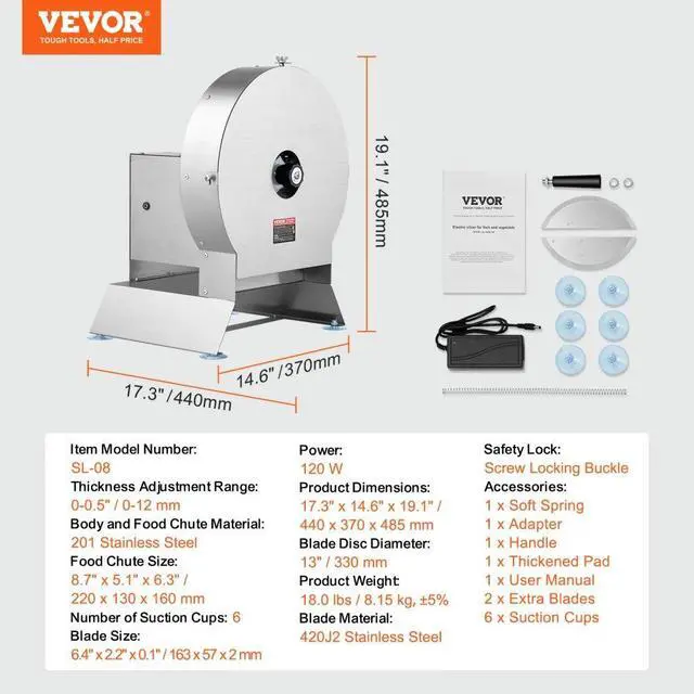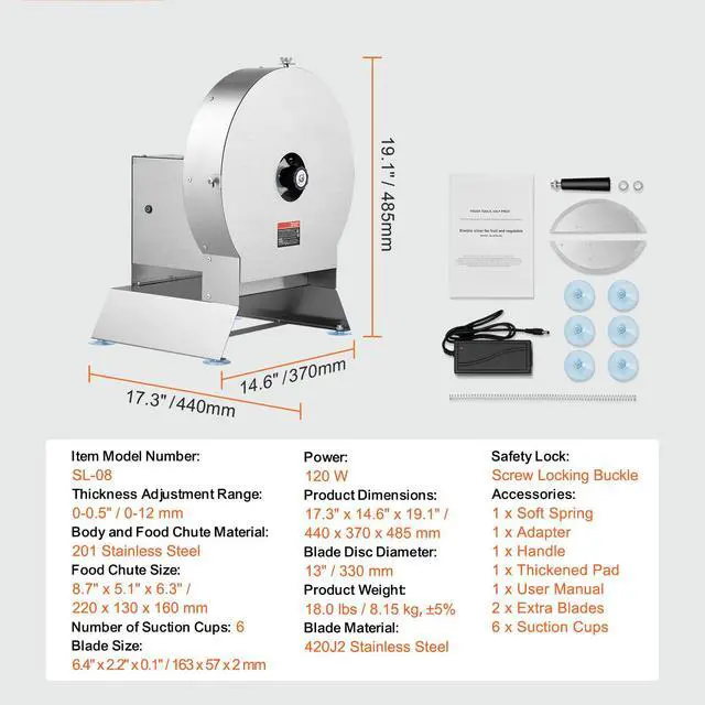 Body Material: 201 Stainless Steel,Thickness Adjustment Range: 0-0.5" / 0-12 mm,Item Model Number: SL-08,Food Chute Size: 8.7" x 5.1" x 6.3" / 220 x 130 x 160 mm,Product Weight: 18.0 lbs / 8.15 kg±5%,Number of Suction Cups: 6,Product Dimensions: 17.3" x 14.6" x 19.1" / 440 x 370 x 485 mm,Power: 120 W