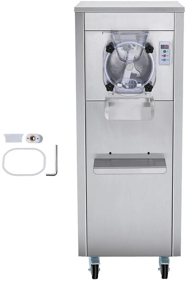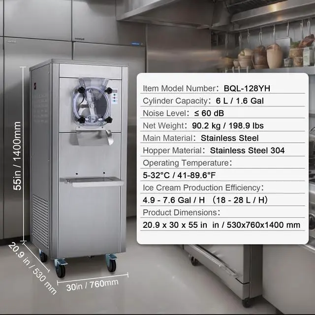 Noise Level: 66 dB,Operating Temperature: 5-32°C / 41-89.6°F,Ice Cream Production Efficiency: 18 L/4.8 Gal per Hour,Hopper Material: Stainless Steel 304,Item Model Number: BQL-128YH,Cylinder Capacity: 6 L/1.6 Gal,Net Weight: 90.2 kg/198.9 lbs,Main Material: Stainless Steel 201