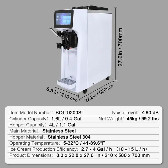 Noise Level: 66 dB,Operating Temperature: 5-32°C / 41-89.6°F,Ice Cream Production Efficiency: 10L /2.7Gal per Hour,Ingredient Tank Capacity: 4L / 1.1 Gal,Hopper Material: Stainless Steel 304,Item Model Number: BQL-9200ST,Cylinder Capacity: 1.6L / 0.4 Gal,Net Weight: 45kg / 99.2 lbs,Main Material: Stainless Steel 201