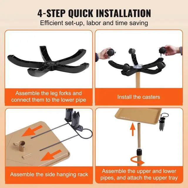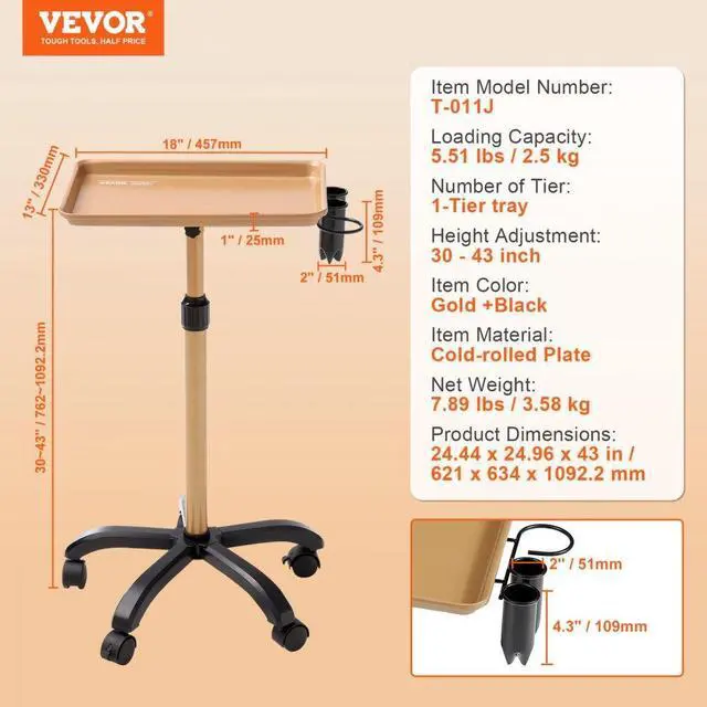 Height Adjustment: 30 - 43 inch,Item Material: Cold-rolled Plate,Item Color: Gold +Black,Item Model Number: T-011J,Loading Capacity: 5.51 lbs / 2.5 kg,Product Dimensions: 24.44 x 24.96 x 43 in / 621 x 634 x 1092.2 mm,Net Weight: 7.89 lbs / 3.58 kg,Number of Tier: 1-Tier tray