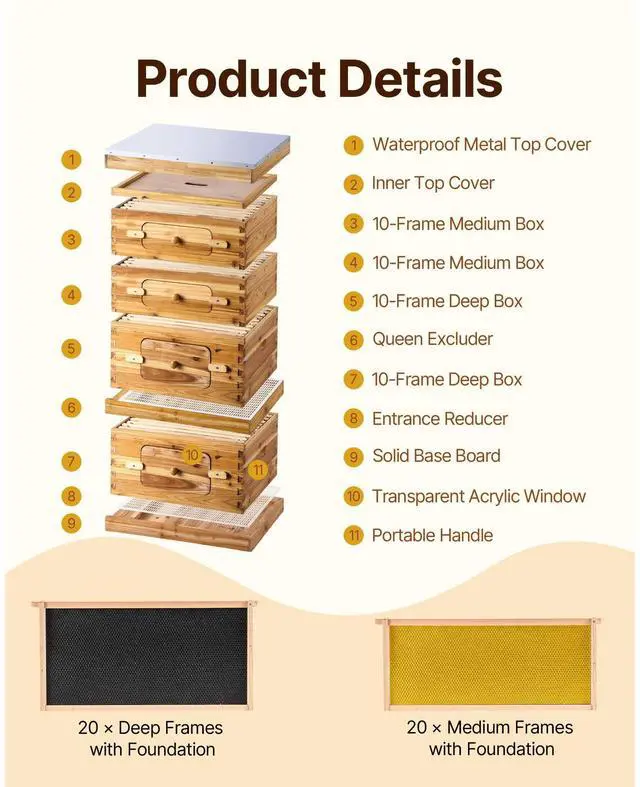 VEVOR Bee Hive 40 Frame Bee Hives Starter Kit, Beeswax Coated Cedar Wood, 2 Deep + 2 Medium Bee Boxes Langstroth Beehive Kit, Transparent Acrylic Windows with Foundations for Beginners Pro Beekeepers