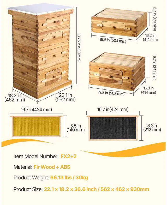 Capacity: 40 Frames,Medium Box Dimensions: 504 x 412 x 170mm / 19.84 x 16.22 x 6.69inch,Deep Box Dimensions: 503 x 414 x 245mm / 19.80 x 16.30 x 9.65inch,Model: FX2+2,Product Weight: 30 kg / 66.13 lbs,Medium Frame Dimensions: 482 x 160 x 35mm / 18.98 x 6.30 x 1.38inch,Deep Frame Dimensions: 482 x 232 x 35mm / 18.98 x 9.13 x 1.38inch,Bottom Base: 560 x 460 x 70mm / 22.05 x 18.11 x 2.76inch,Product Dimensions: 562 x 462 x 930mm / 22.13 x 18.19 x 36.61inch,Top Cover Dimensions: 562 x 462 x 72mm / 22.13 x 18.19 x 2.83inch,Top Vent Dimensions: 504 x 412 x 25mm / 19.84 x 16.22 x 0.98inch