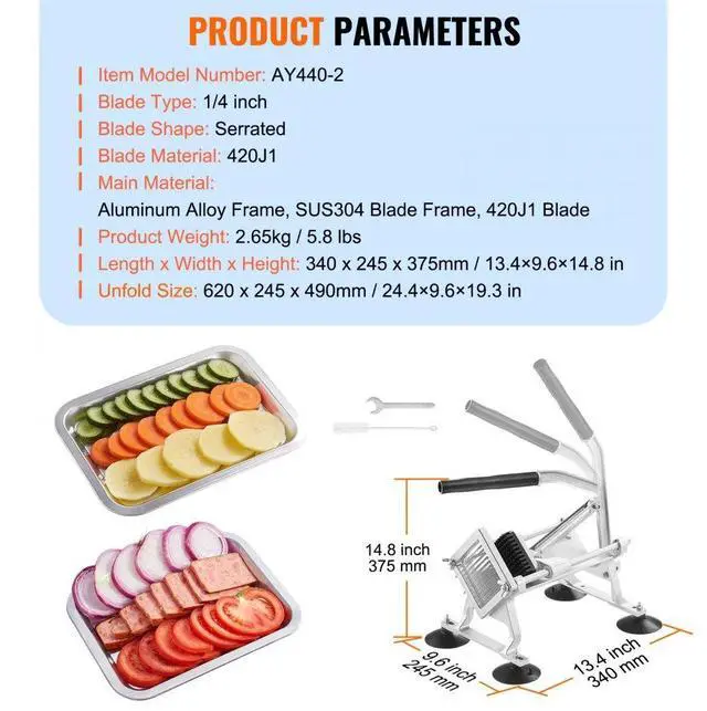 Blade Material: 420J1,Blade Type: 1/4 inch,Blade Shape: Serrated,Item Model Number: AY440-2,Product Weight: 2.65kg / 5.8 lbs,Main Material: Aluminum Alloy Frame, SUS304 Blade Frame, 420J1 Blade