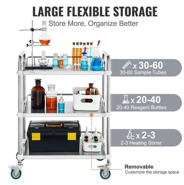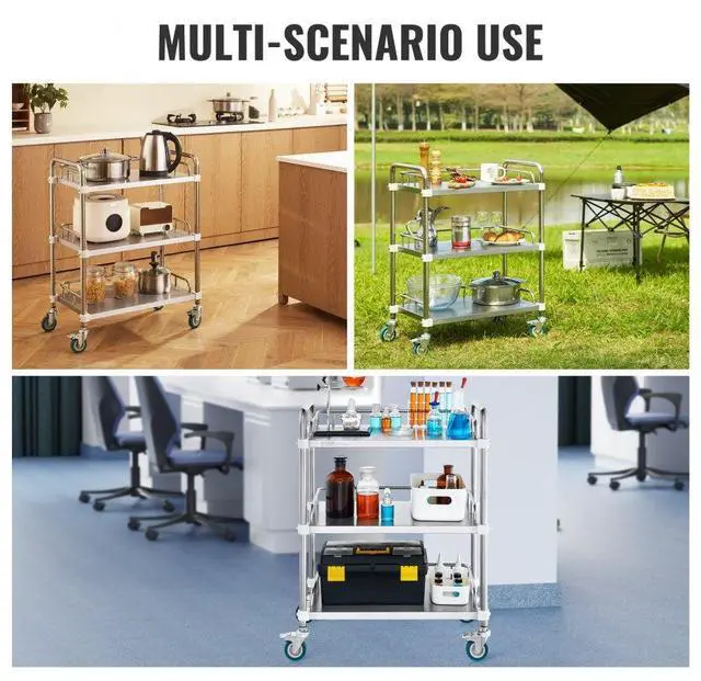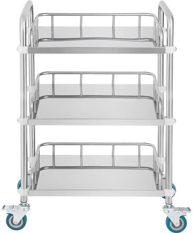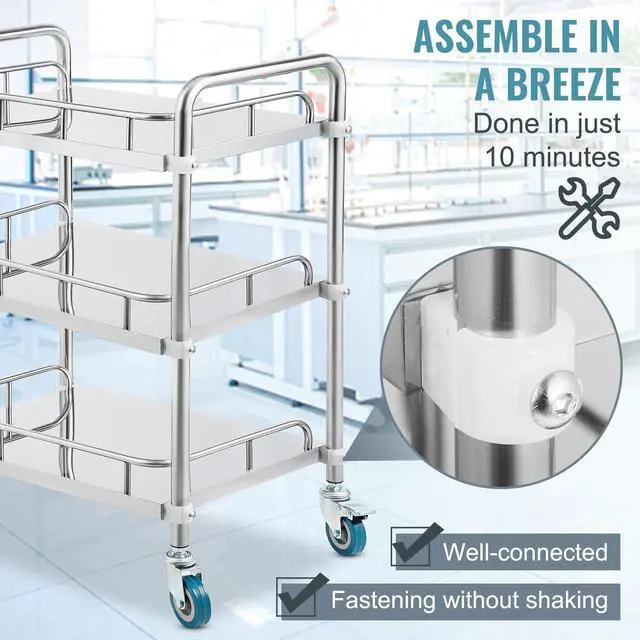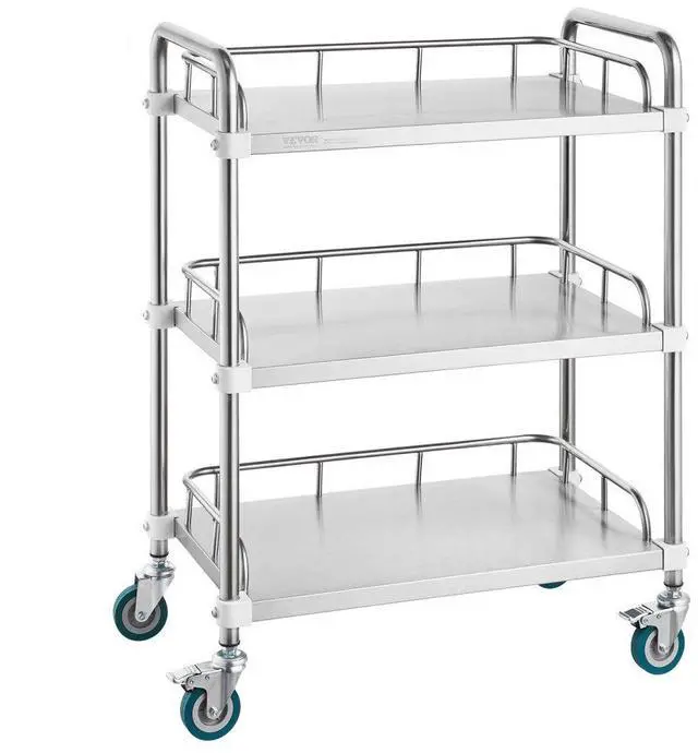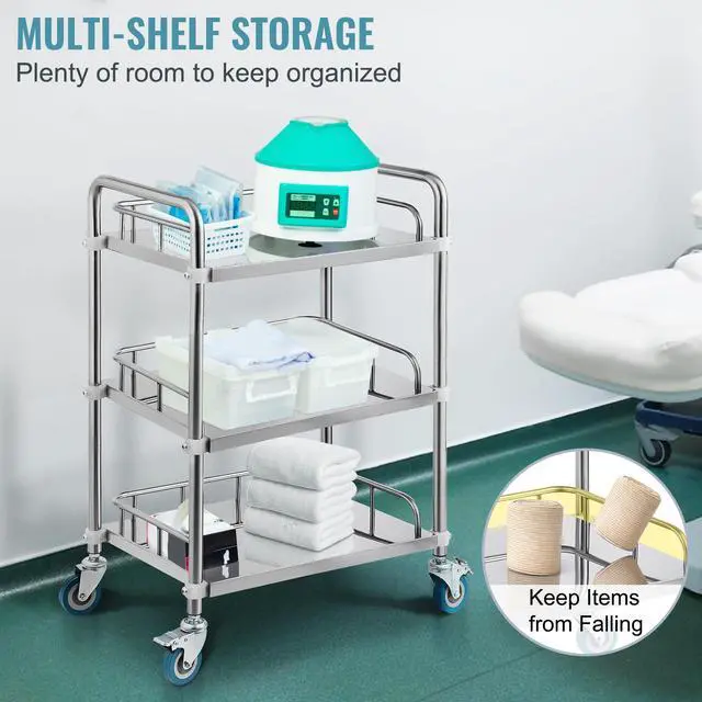 VEVOR Lab Rolling Cart, 3-Shelf Stainless Steel Rolling Cart, Lab Serving Cart with Swivel Casters, Dental Utility Cart for Clinic, Lab, Hospital, Salon, 26.38"x15.55"x34.13"