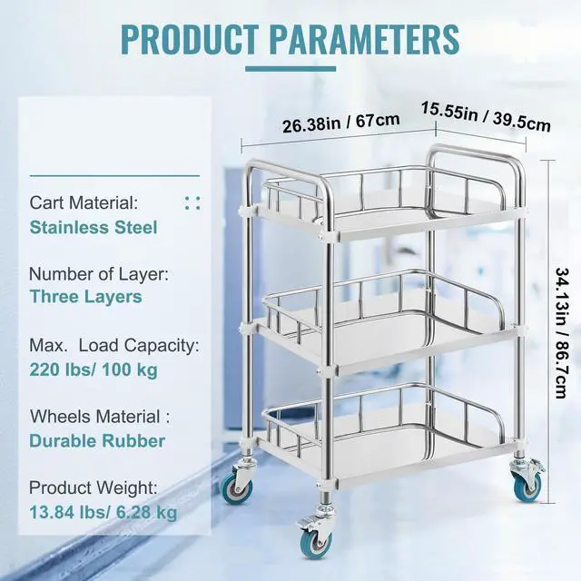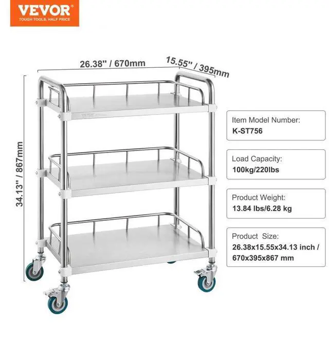 Wheel: Omnidirectional, Lockable,Item Model Number: K-ST756,Product Weight: 13.84 lbs/6.28 kg,Material: Stainless Steel,Maximum Weight Capacity: 220 lbs/100 kg,Layer: 3,Product Size: 26.38x15.55x34.13 inch/670x395x867 mm