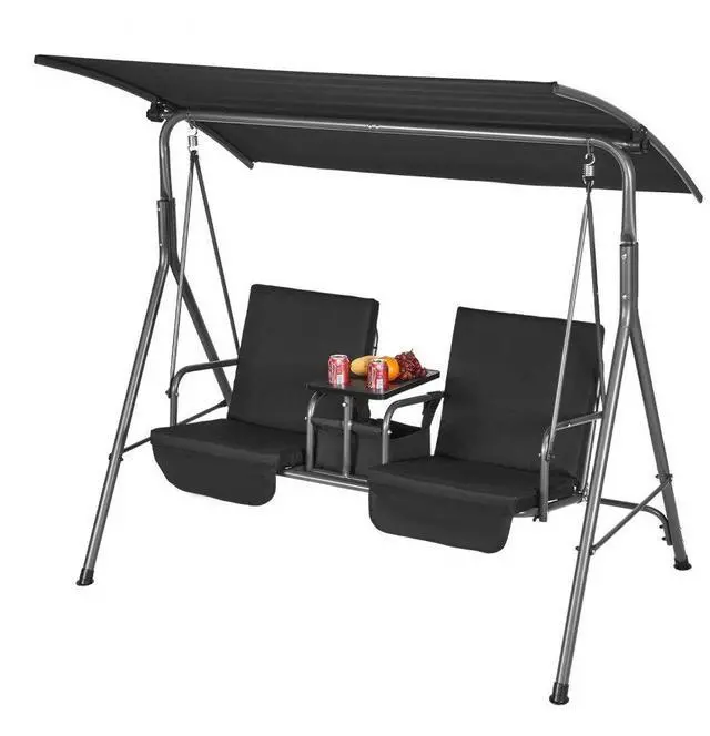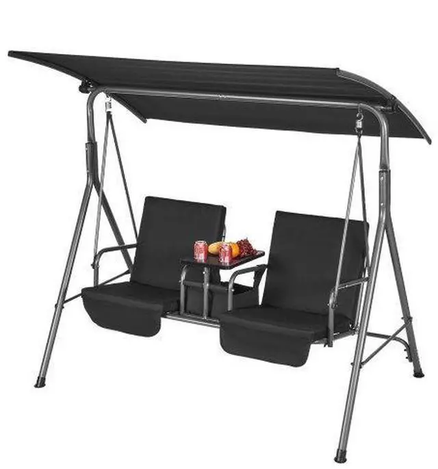 • VEVOR 2-Seat Patio Swing Chair, Outdoor Patio Swing with Adjustable Canopy, Porch Swing with Storage Bag and Rotating Tray, Oxford Fabric and Alloy Steel Frame, for Balcony, Backyard, Poolside, Black