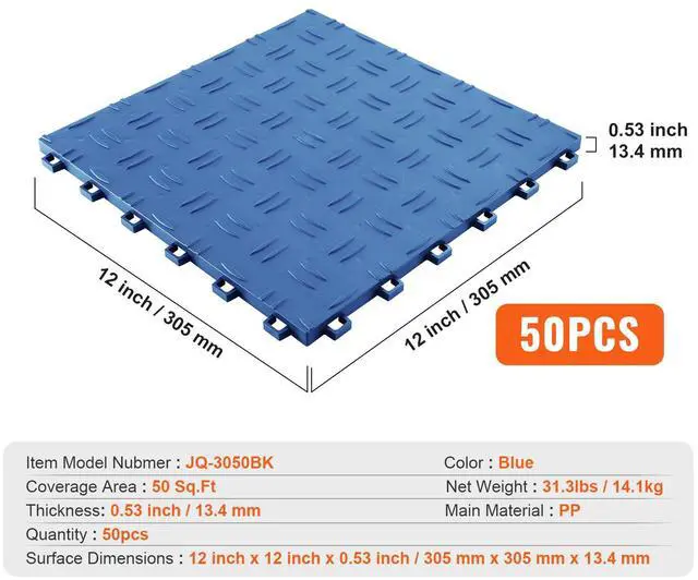 Thickness: 0.53 inch / 13.4 mm,Sizes: 12 x 12 x 0.53 inch / 305 x 305 x 13.4 mm,Color: Blue,Item Model Number: JQ-3050BU,Quantity: 50pcs,Coverage Area: 50 Sq.Ft,Main Material: PP