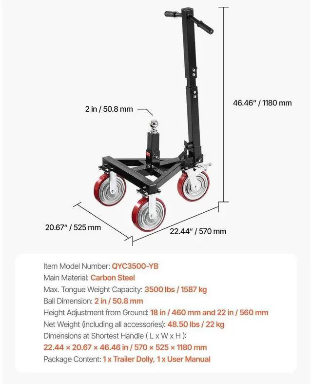 Net Weight (including all accessories): 48.50 lbs / 22 kg,Dimensions with Handle at Max Height (LxWxH): 22.44 x 20.67 x 46.46 in / 570 x 525 x 1180 mm,Height Adjustment from Ground: 18 in / 460 mm and 22 in / 560 mm,Item Model Number: QYC3500-YB,Ball Dimension: 2 in / 50.8 mm,Max. Tongue Weight Capacity: 3500 lbs / 1587 kg,Main Material: Carbon Steel