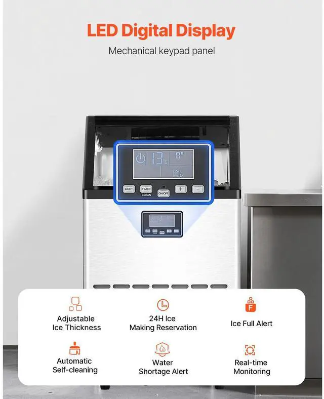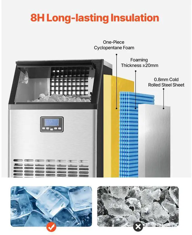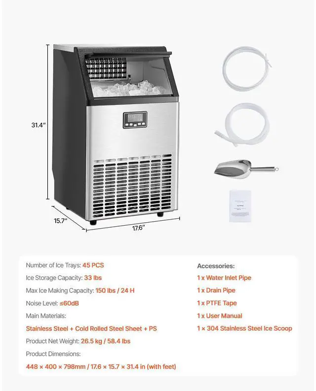 Noise Level: 60dB,Number of Ice Trays: 45 PCS,Max Ice Making Capacity: 150 lbs / 24 H,Main Materials: Stainless Steel + Cold Rolled Steel Sheet + PS,Item Model Number: HZB-45,Product Net Weight: 26.5 kg / 58.4 lbs,Ice Storage Capacity: 33 lbs,Product Dimensions: 448 x 400 x 798mm / 17.6 x 15.7 x 31.4 in (with feet)