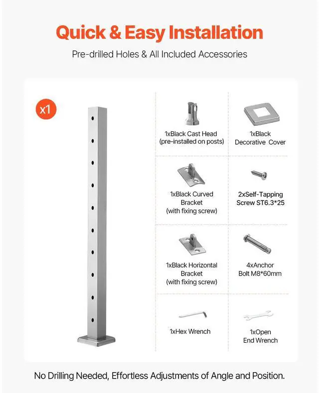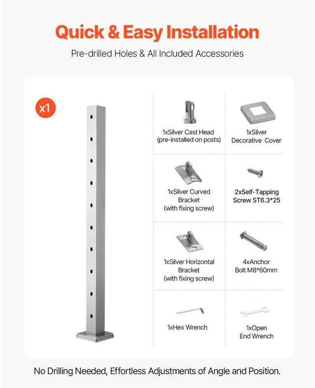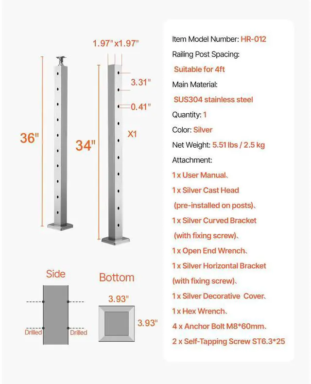Number of Holes: 10,Color: Silver,Item Model Number: HR-012,Quantity: 1,Railing Post Spacing: Suitable for up to 4ft,Net Weight(include Accessories): 5.51 lbs/2.5kg (±3%),Main Material: SUS304 Stainless Steel