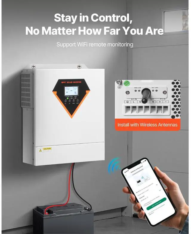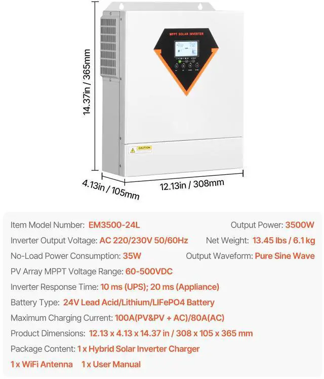 PV Array MPPT Voltage Range: 60-500VDC,Maximum Charging Current: 100A (PV & PV + AC) / 80A (AC),Output Power: 3500W,Inverter Output Voltage: AC 220/230V 50/60Hz,Item Model Number: EM3500-24L,No-Load Power Consumption: 35W,Product Dimensions: 14.37 x 12.13 x 4.13 in / 365 x 308 x 105 mm,Battery Type: 24V Lead Acid/Lithium/LIFePO4 Battery,Net Weight: 13.45 lbs / 6.1 kg,Inverter Response Time: 10 ms (UPS); 20 ms (Appliance),Output Waveform: Pure Sine Wave