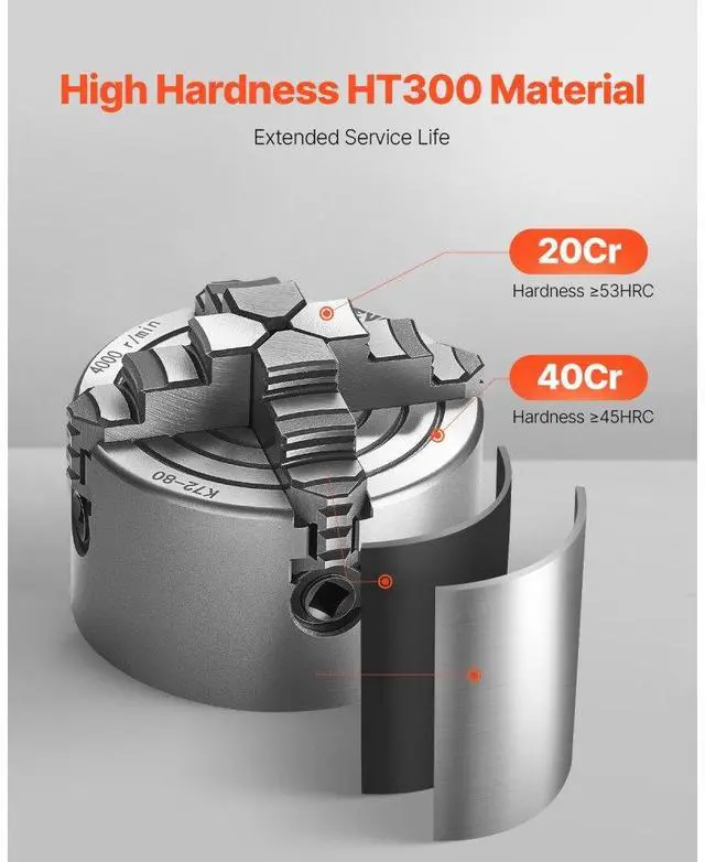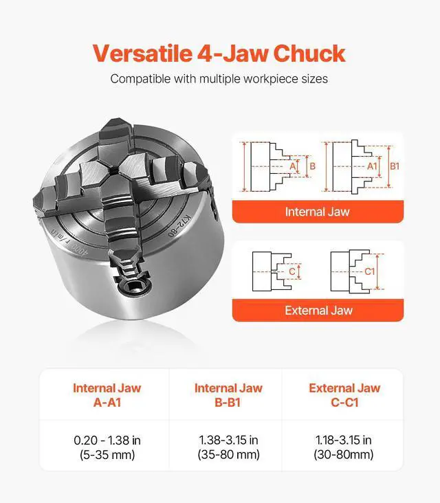 Outer Diameter: 3 in / 80 mm,Product Type: 4-Jaw, Internal Jaw, Step Jaw,Inner Diameter: 0.86 in / 22 mm,Item Model Number: K72 80,Item Dimensions: 3.15 x 2.56 in/ 80 x 65 mm,Internal Jaw Clamping Range: 0.1-3.15 in / 5-80 mm,External Jaw Clamping Range: 1.18-3.15 in / 30-80 mm,Net Weight: 3.86 lbs / 1.75 kg,Main Material: HT300