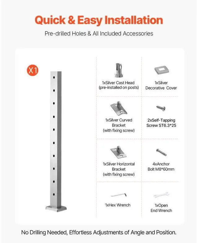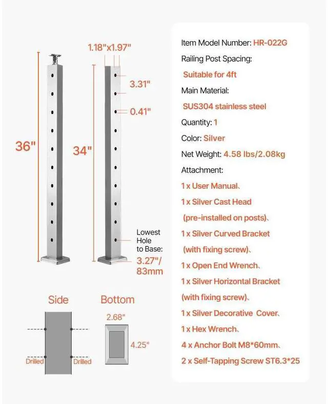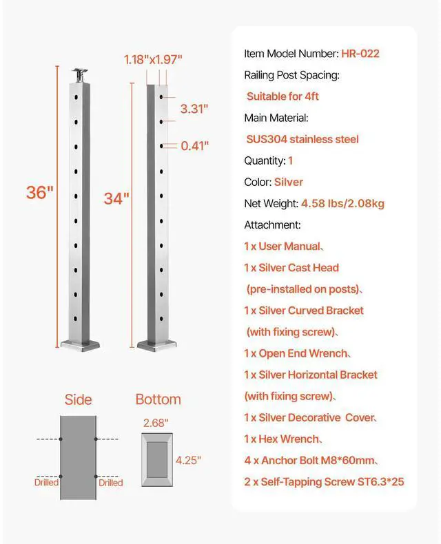 Thickness: 0.06"/1.5 mm,Connect Methods: Concrete/Wood,Item Size: 36 x 0.98 x 1.97"/91.4 x 2.5 x 5 cm,Base Size: 4.56 x 2.99 x 0.61"/116 x 76 x 15.5 mm,Holes Distance: 3.15"/80 mm,Color: Silver,Item Model Number: VV-91.4x5x5-LGZWKSLIVERDZ,Material: Stainless Steel+Powder Coated,Hole Diameter: 0.307"/7.8 mm,Item Weight: 1.8 kg/4 lbs