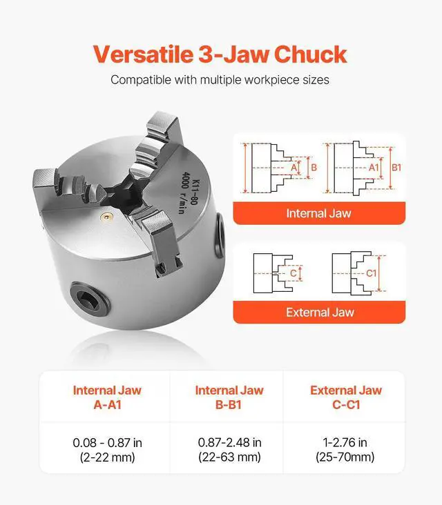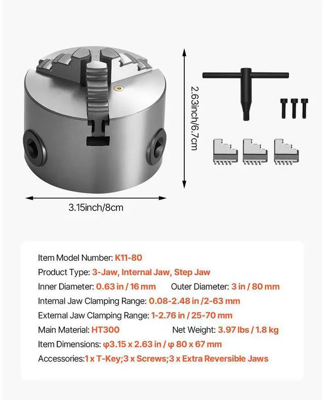 Outer Diameter: 3 in / 80 mm,Product Type: 3-Jaw, Internal Jaw, Step Jaw,Inner Diameter: 0.63 in / 16 mm,Item Model Number: K11 80,Item Dimensions: 3.15 x 2.63 in / 80 x 67 mm,Internal Jaw Clamping Range: 0.08-2.48 in /2-63 mm,External Jaw Clamping Range: 1-2.76 in / 25-70 mm,Net Weight: 3.97 lbs / 1.8 kg,Main Material: HT300