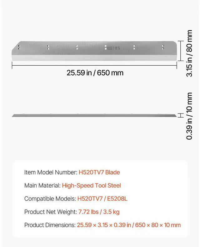 Compatible Models: H520TV7 / E5208L,Item Model Number: H520TV7 Blade,Product Net Weight: 7.72 lbs / 3.5kg,Product Dimensions: 25.59 x 3.15 x 0.39 inches / 650 x 80 x 10mm,Main Material: High-Speed Tool Steel