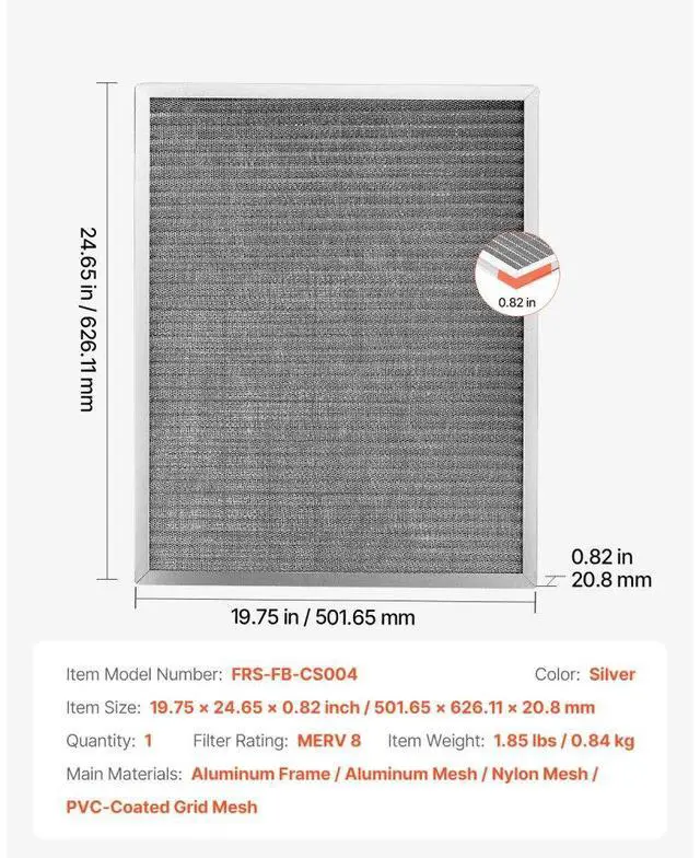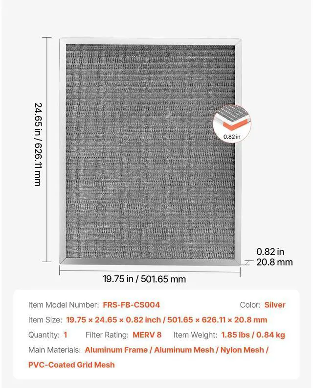 Main Materials: Aluminum Frame / Mesh / Nylon Mesh / PVC-Coated Grid Mesh,Item Size: 19.75 x 24.65 x 0.82 inch / 501.65 x 626.11 x 20.8 mm,Color: Silver,Item Model Number: FRS-FB-CS004,Quantity: 1,Filter Rating: MERV 8,Item Weight: 1.85 lbs / 0.84 kg