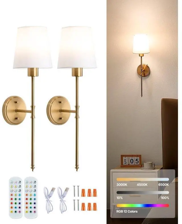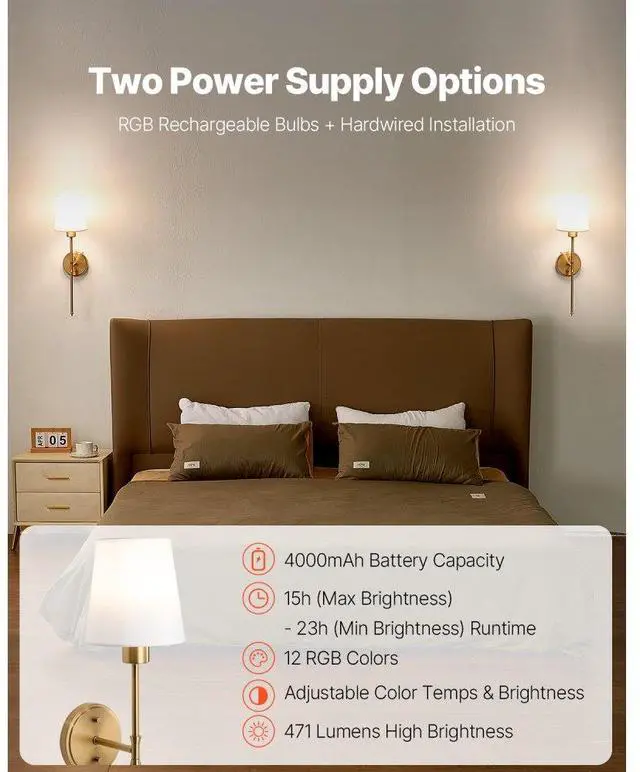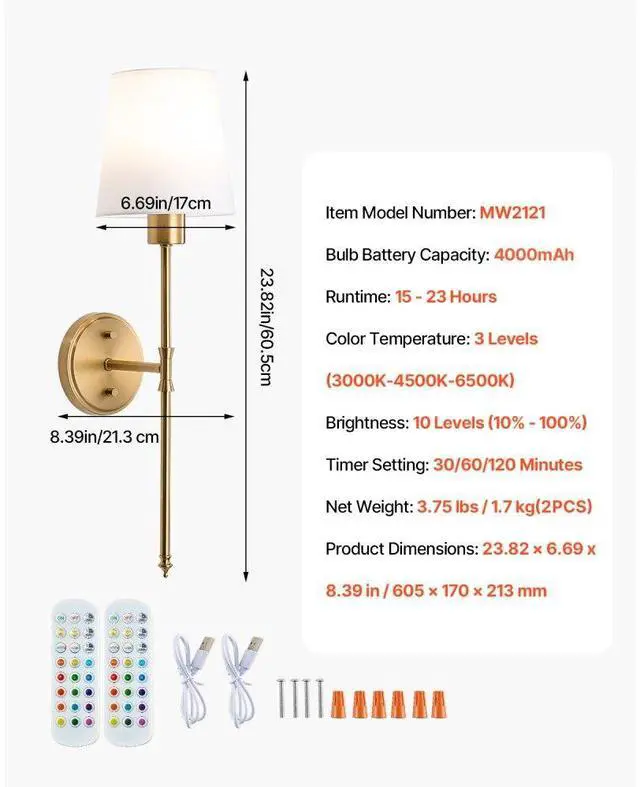 Battery Operated Wall Sconce Set of 2 Wireless Wall Lights with Remote Control Easy Charging Multiple Lighting Modes High Quality & Durable 2 Power Supply Options Timer and Memory Function 4000mAh Battery Capacity Item Model Number: MW2121