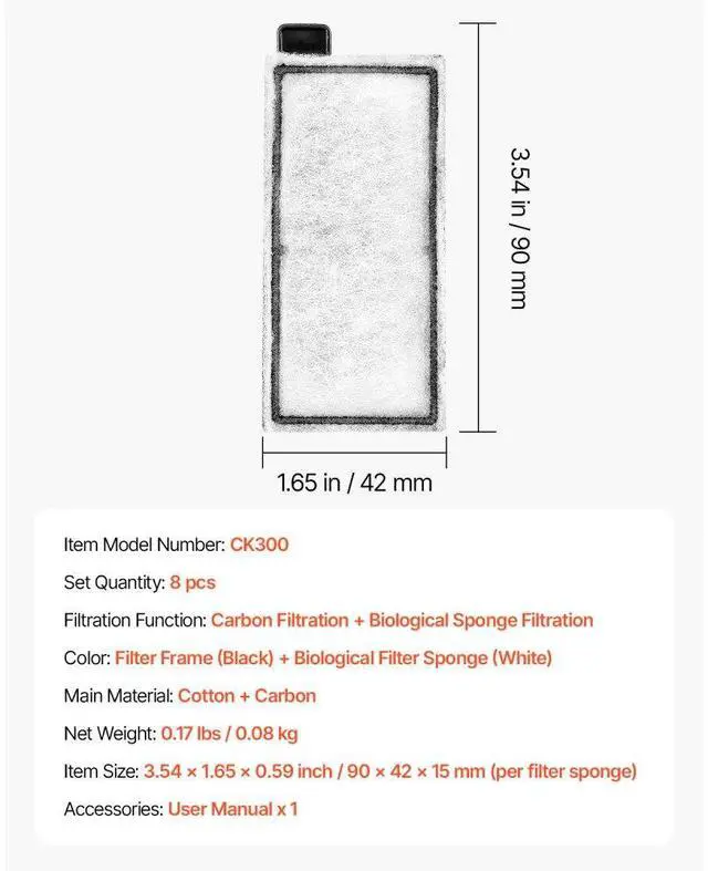 Set Quantity: 8 pcs,Filtration Function: Carbon Filtration + Biological Sponge Filtration,Item Size: 3.54 x 1.65 x 0.59 inch / 90 x 42 x 15 mm (per filter sponge),Item Model Number: CK300,Net Weight: 0.12 lbs / 0.053 kg,Main Material: Cotton + Carbon