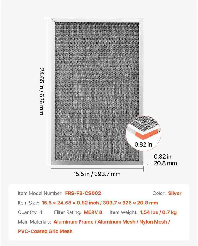 Main Materials: Aluminum Frame / Mesh / Nylon Mesh / PVC-Coated Grid Mesh,Item Size: 15.5 x 24.65 x 0.82 inch / 393.7 x 626 x 20.8 mm,Color: Silver,Quantity: 1,Filter Rating: MERV 8,Item Weight: 1.54 lbs / 0.7 kg