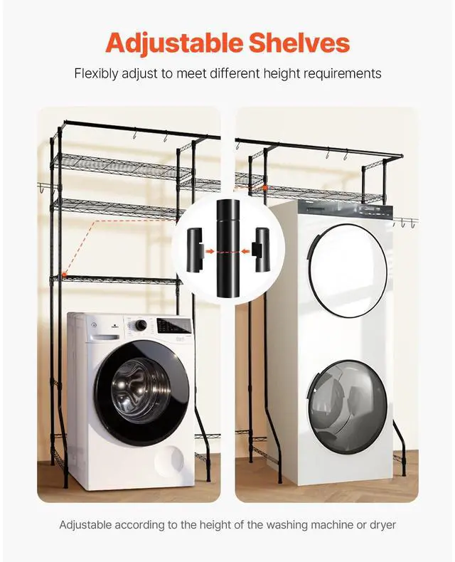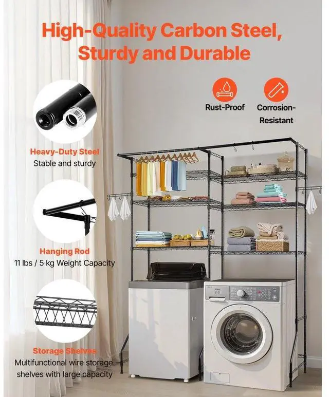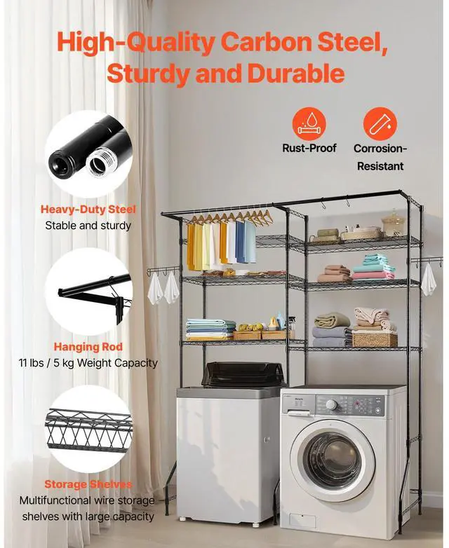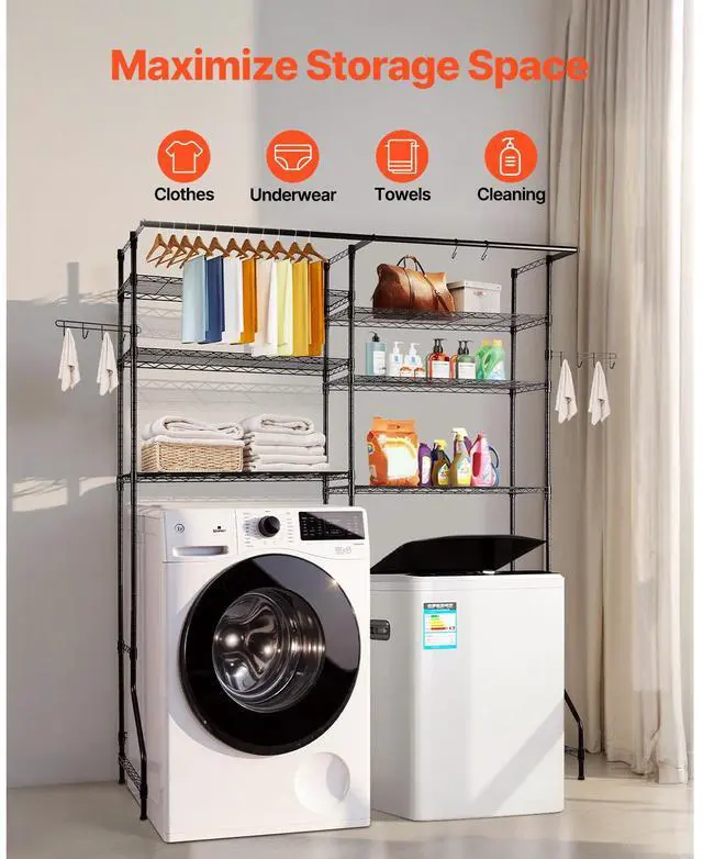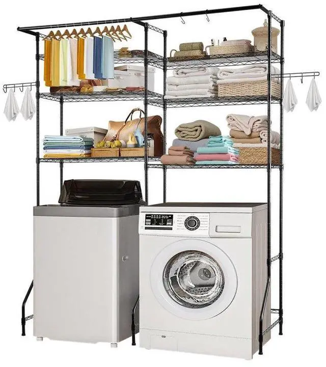 Over Washer and Dryer Storage Shelf Two Row 6 Tiers Washer Rack Black