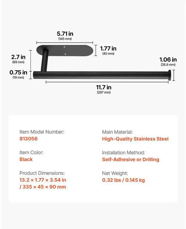 Installation Method: Self-Adhesive or Drilling,Item Color: Black,Item Model Number: 813056,Product Dimensions: 13.2 x 1.77 x 3.54 in / 335 × 45 × 90 mm,Net Weight: 0.32 lbs / 0.145 kg,Main Material: High-Quality Stainless Steel