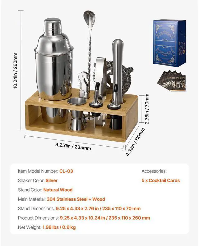 Stand Color: Natural Wood,Shaker Color: Silver,Item Model Number: CL-03,Stand Dimensions: 9.25 x 4.33 x 2.76 in / 235 x 110 x 70 mm,Product Dimensions: 9.25 x 4.33 x 10.24 in / 235 x 110 x 260 mm,Net Weight: 1.98 lbs / 0.9 kg,Main Material: 304 Stainless Steel + Wood