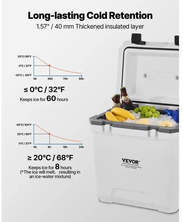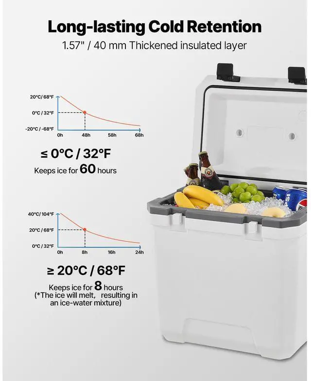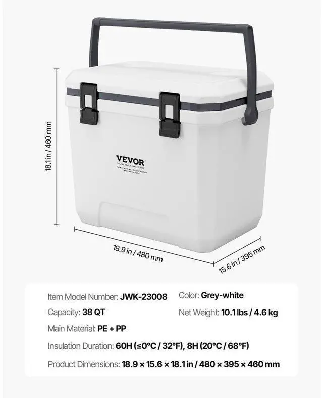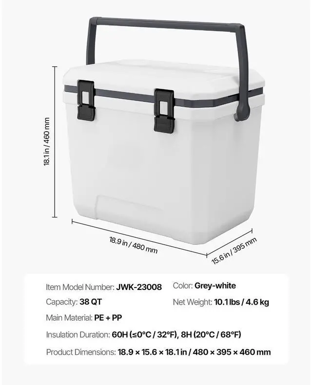Capacity: 38 QT,Color: Grey-white,Item Model Number: JWK-23008,Insulation Duration: 60H (0°C / 32°F), 8H (20°C / 68°F),Product Dimensions: 18.9 x 15.6 x 18.1 in / 480 x 395 x 460 mm,Net Weight: 10.1 lbs / 4.6 kg,Main Material: PE + PP