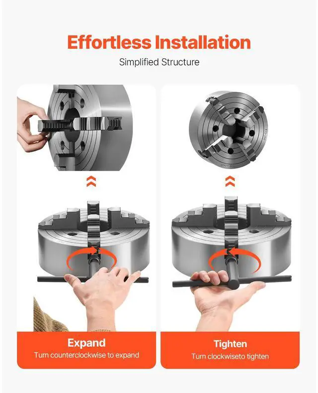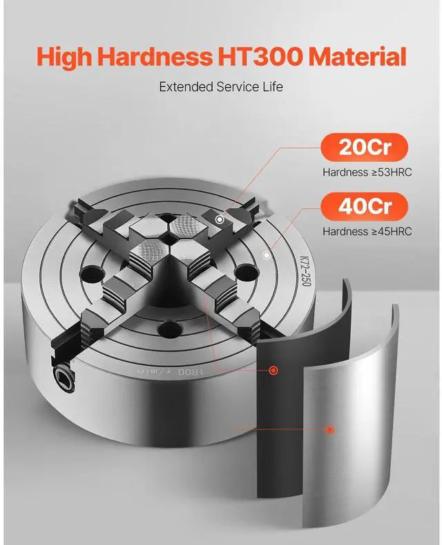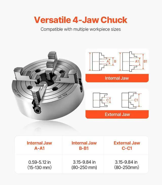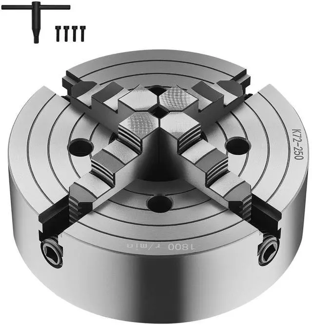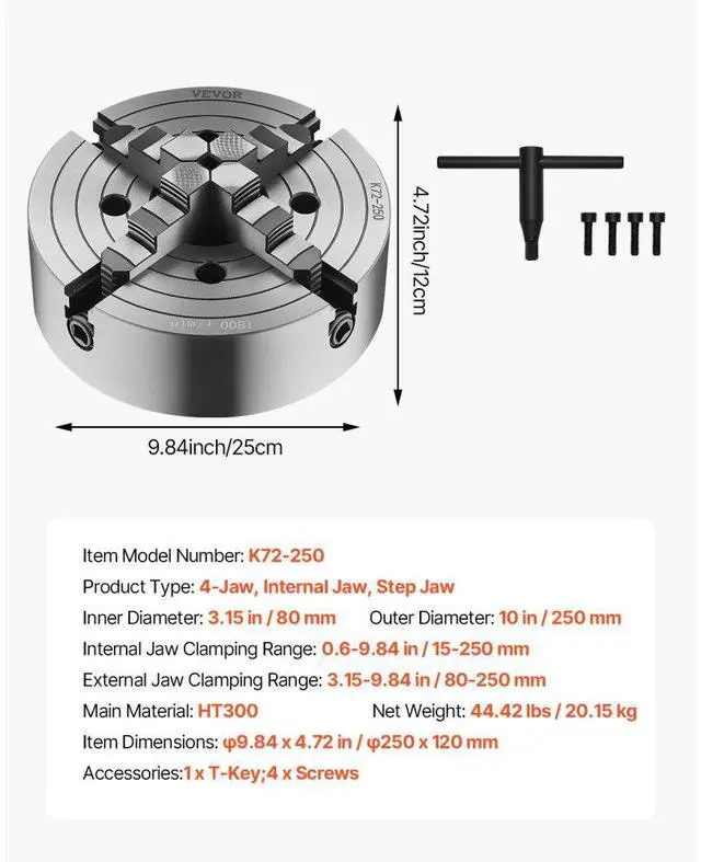 Outer Diameter: 10 in / 250 mm,Product Type: 4-Jaw, Internal Jaw, Step Jaw,Inner Diameter: 3.15 in / 80 mm,Item Model Number: K72 250,Item Dimensions: 9.84 x 4.72 in / 250 x 120 mm,Internal Jaw Clamping Range: 0.6-9.84 in / 15-250 mm,External Jaw Clamping Range: 3.15-9.84 in / 80-250 mm,Net Weight: 44.42 lbs / 20.15 kg,Main Material: HT300